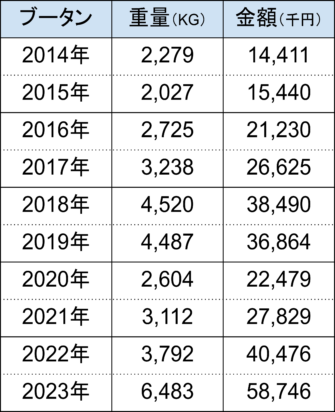 生鮮松茸のブータンからの輸入推移表(10年分)
