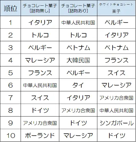 チョコレート輸入(割合重量順位表)