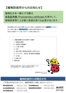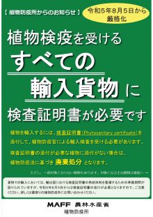令和5年8月5日(2023/8/5)から、日本に輸入する際に植物検疫を受けるすべての貨物に検査証明書が必要になります。