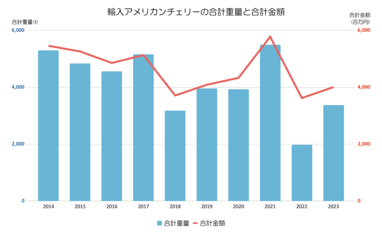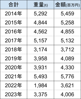 2022年は天候不順により生産量の低下により輸入金額、重量ともに減少していましたが、日本国内の需要に支えられて一定水準での輸入が行われているようです。