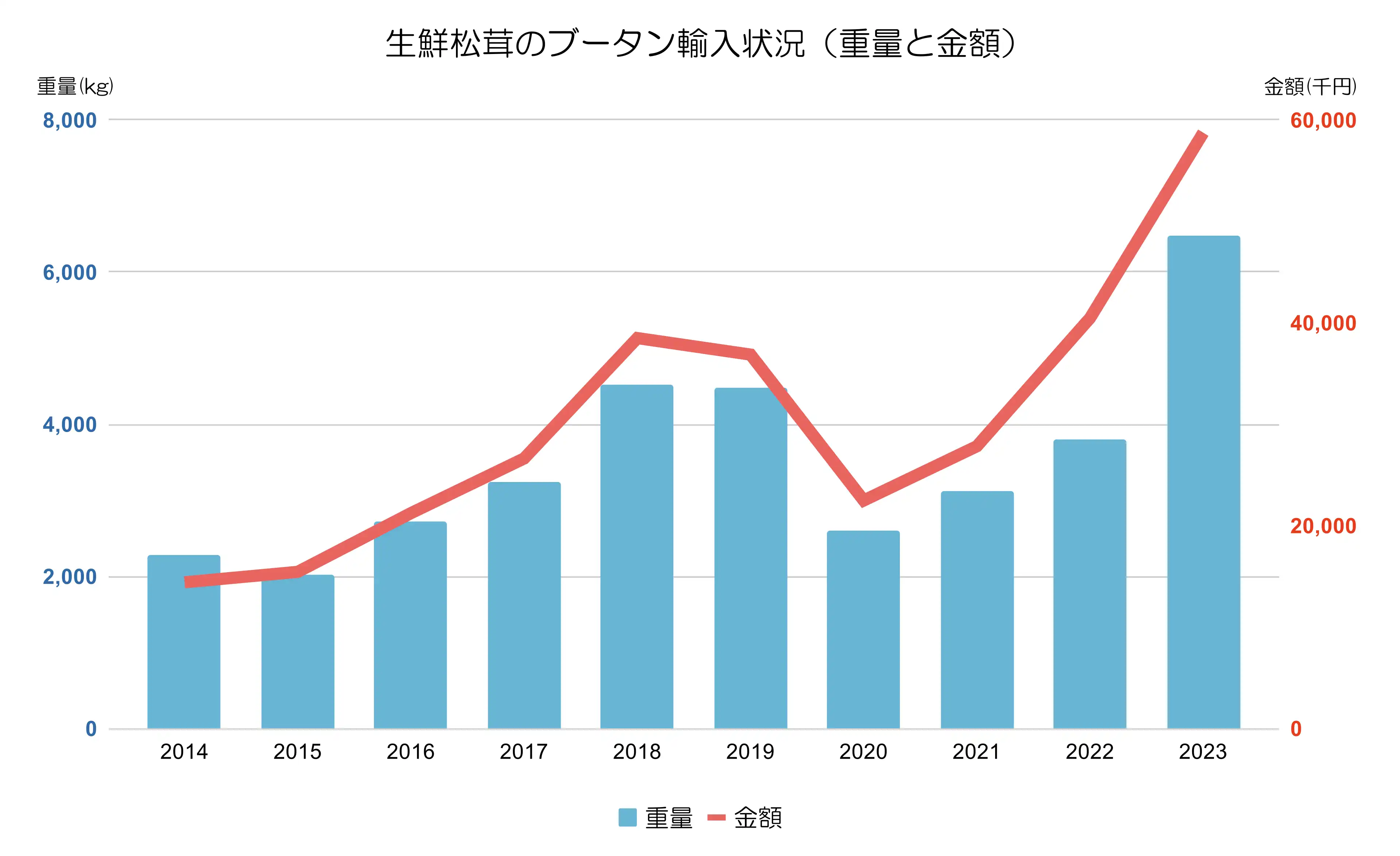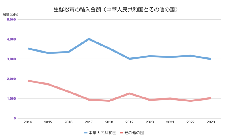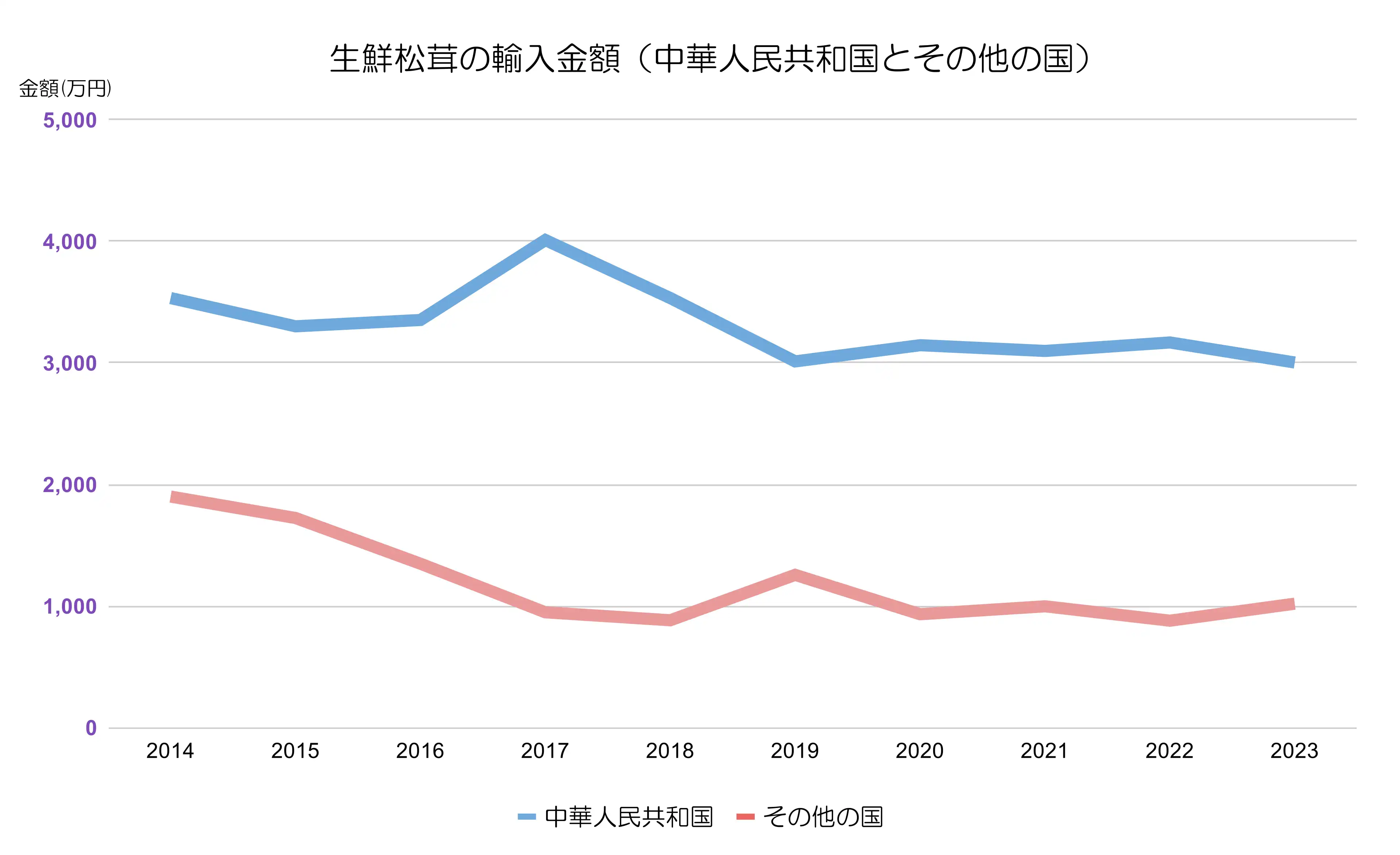生鮮松茸は輸入量、輸入額ともに年々減少傾向にあります。