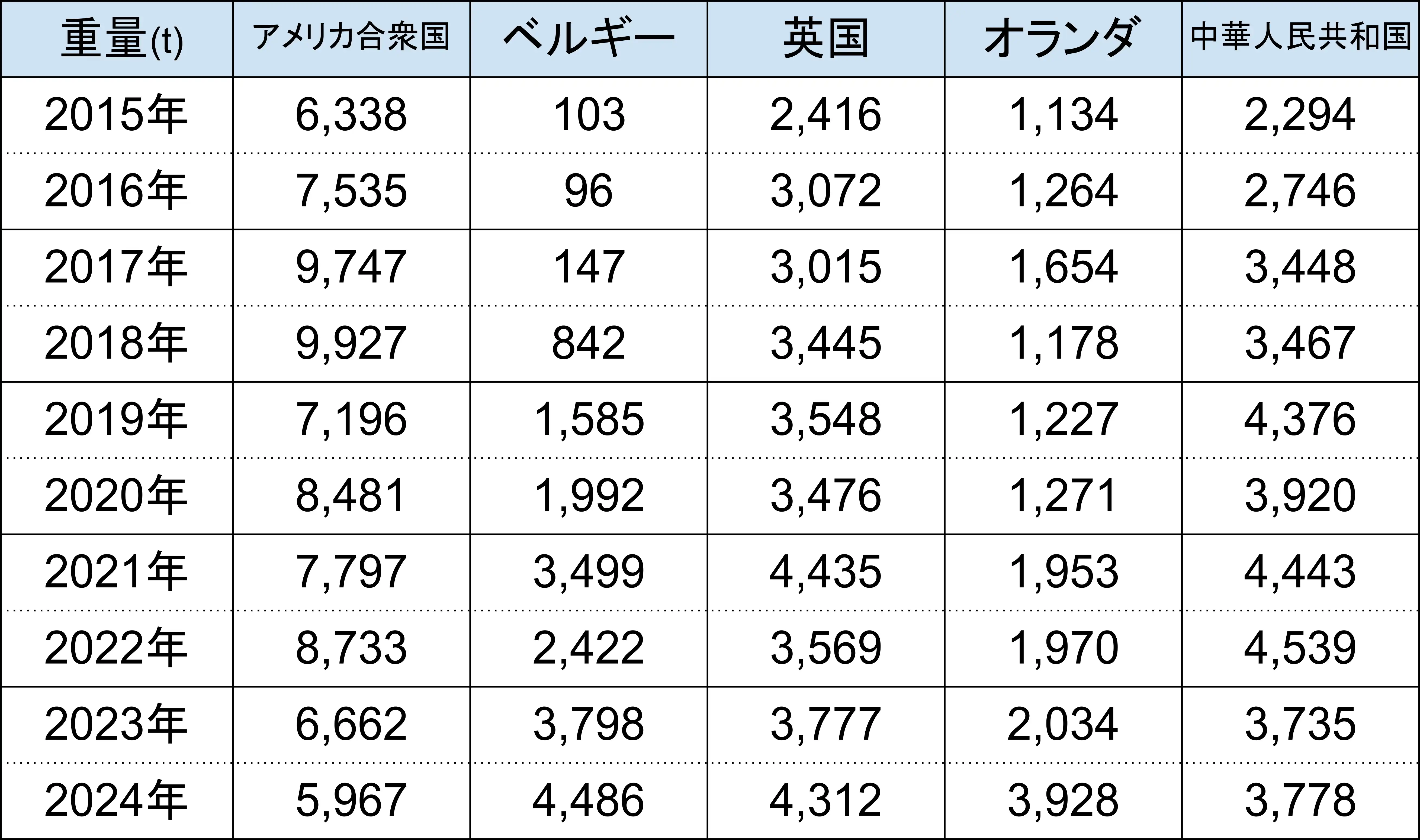 輸出重量と輸出金額について2位以下はバラつきがありますが、1位は共にアメリカ合衆国です。