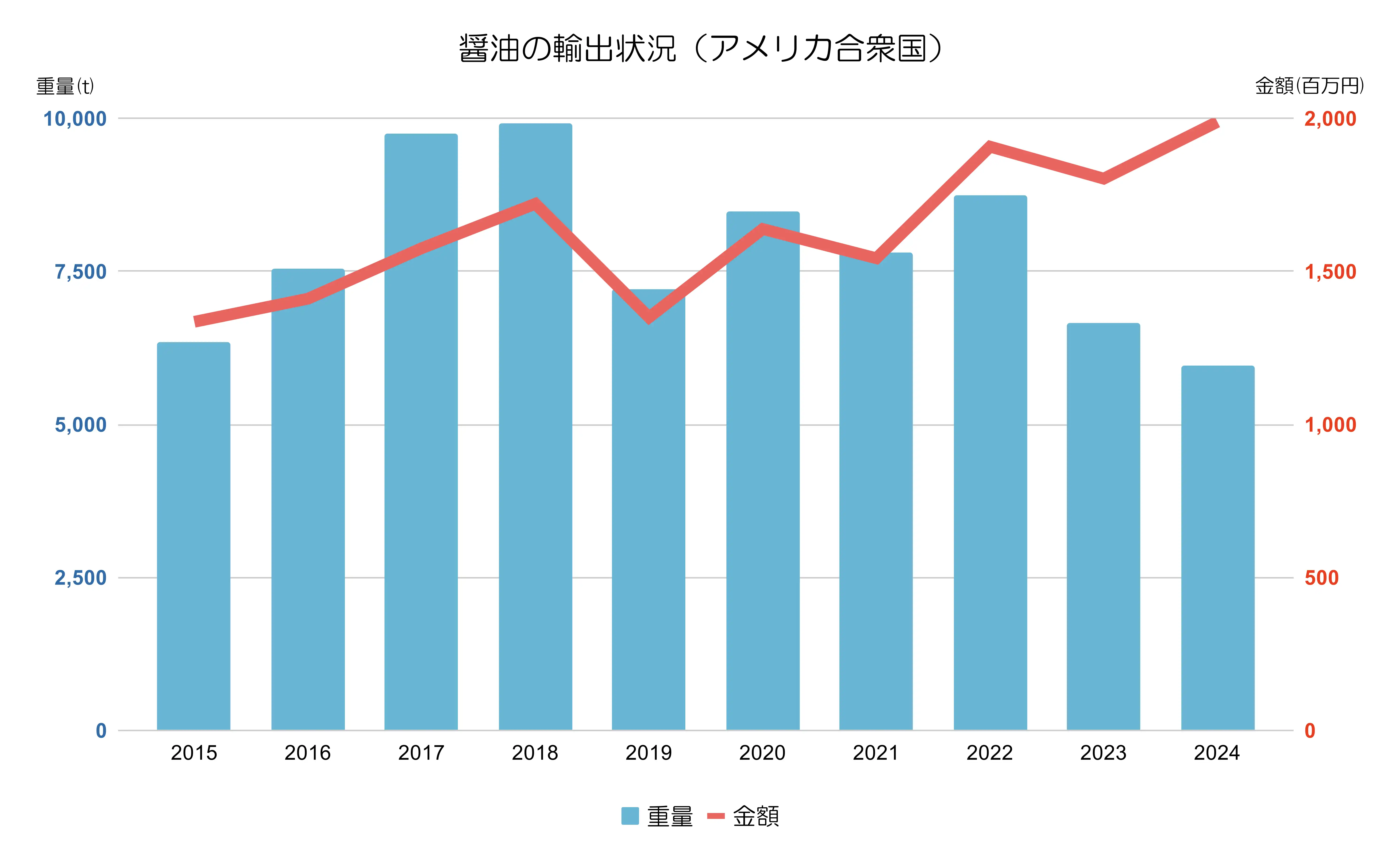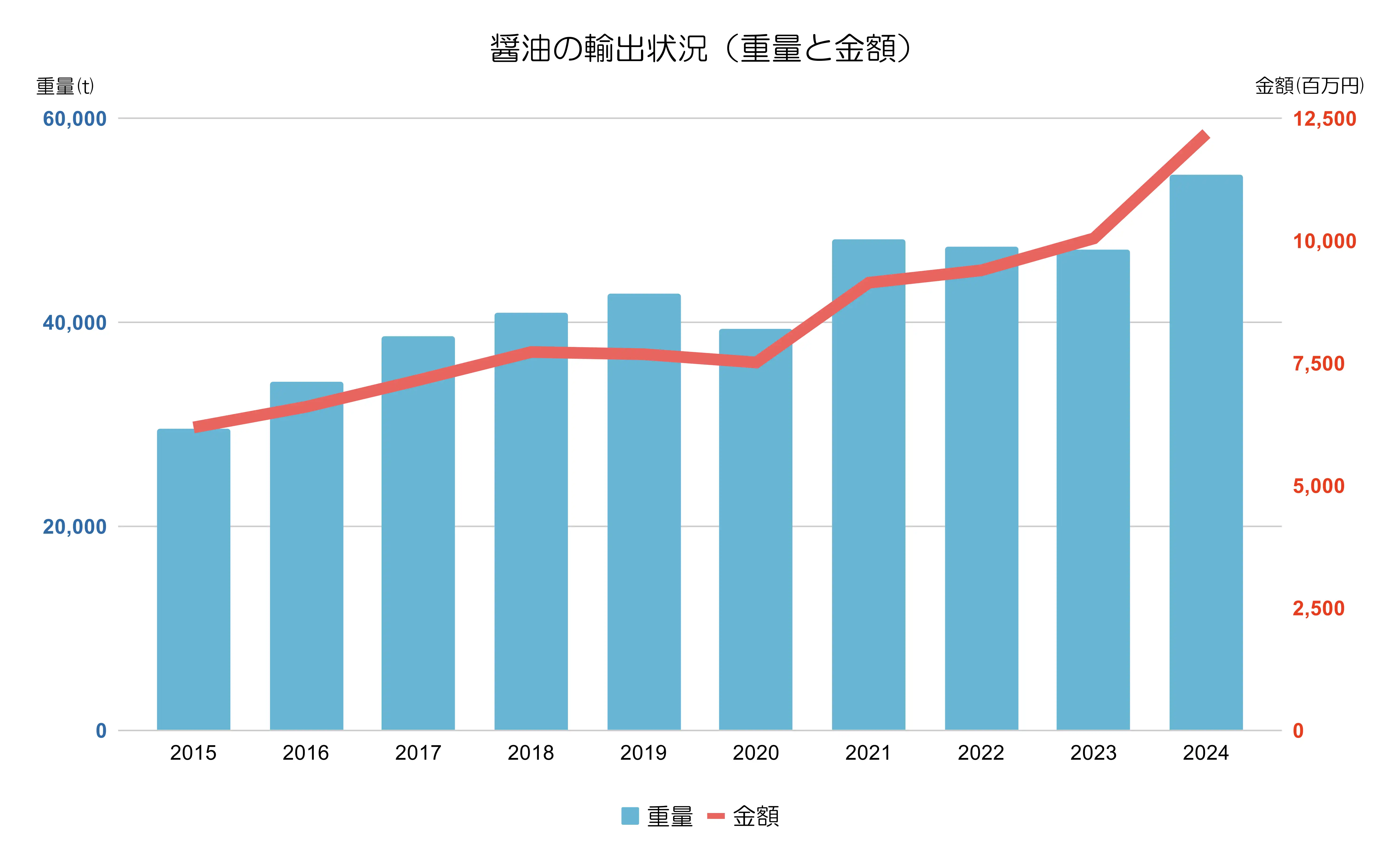 醤油の輸出は重量、金額ともに右肩上がりです。