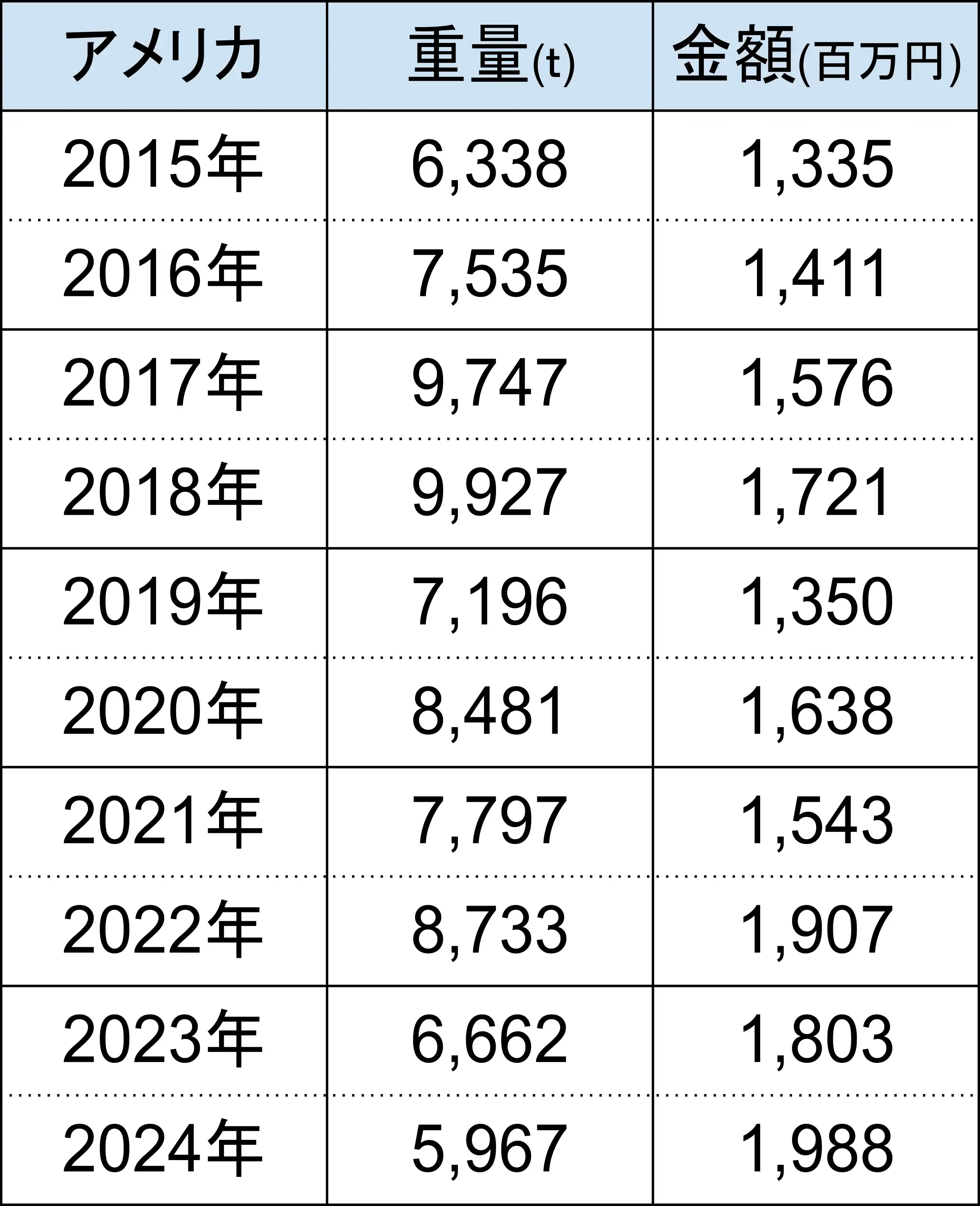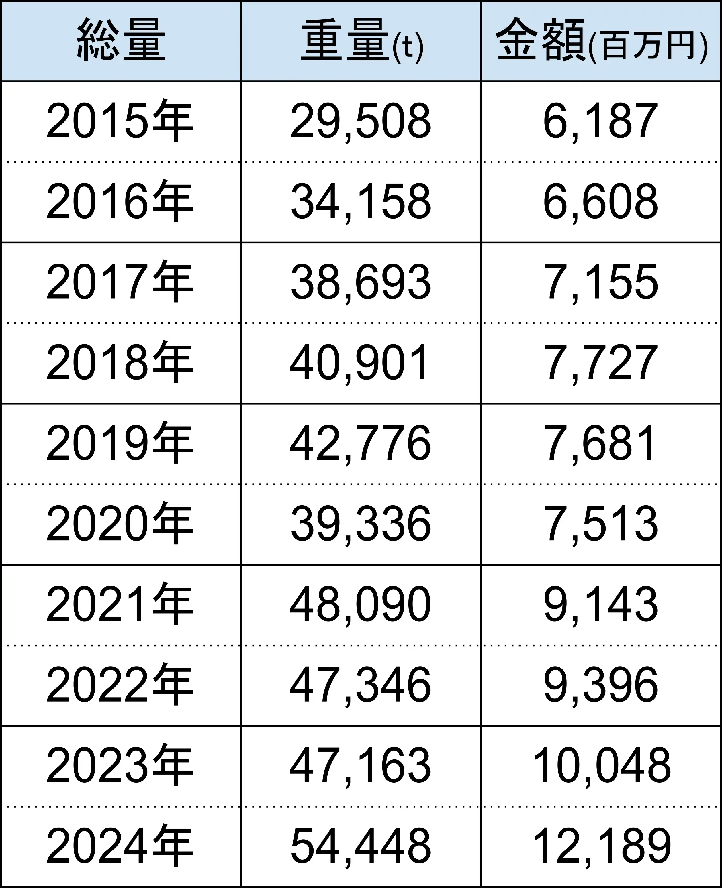 輸出金額は右肩上がりですが、輸出重量は減少傾向にあります。