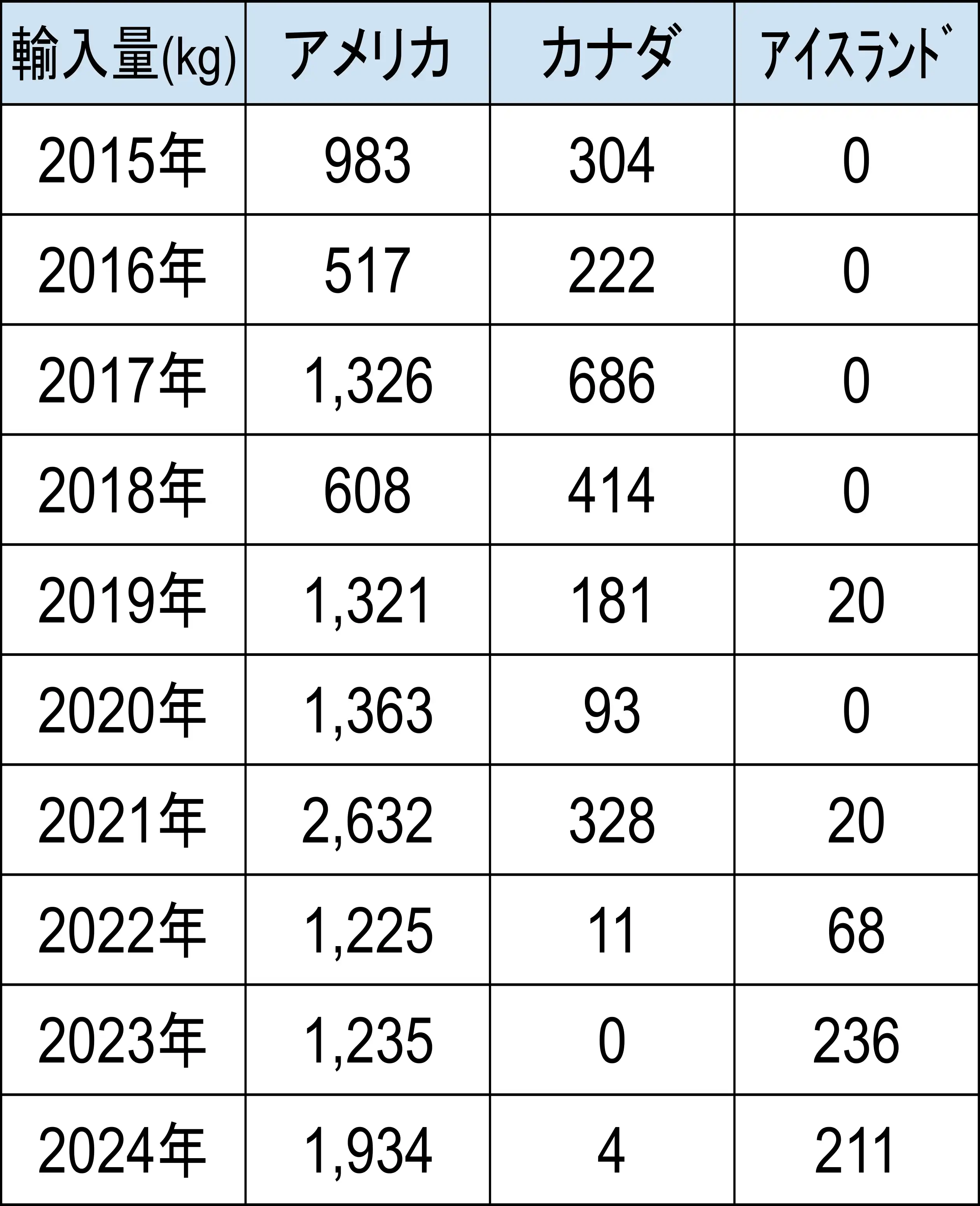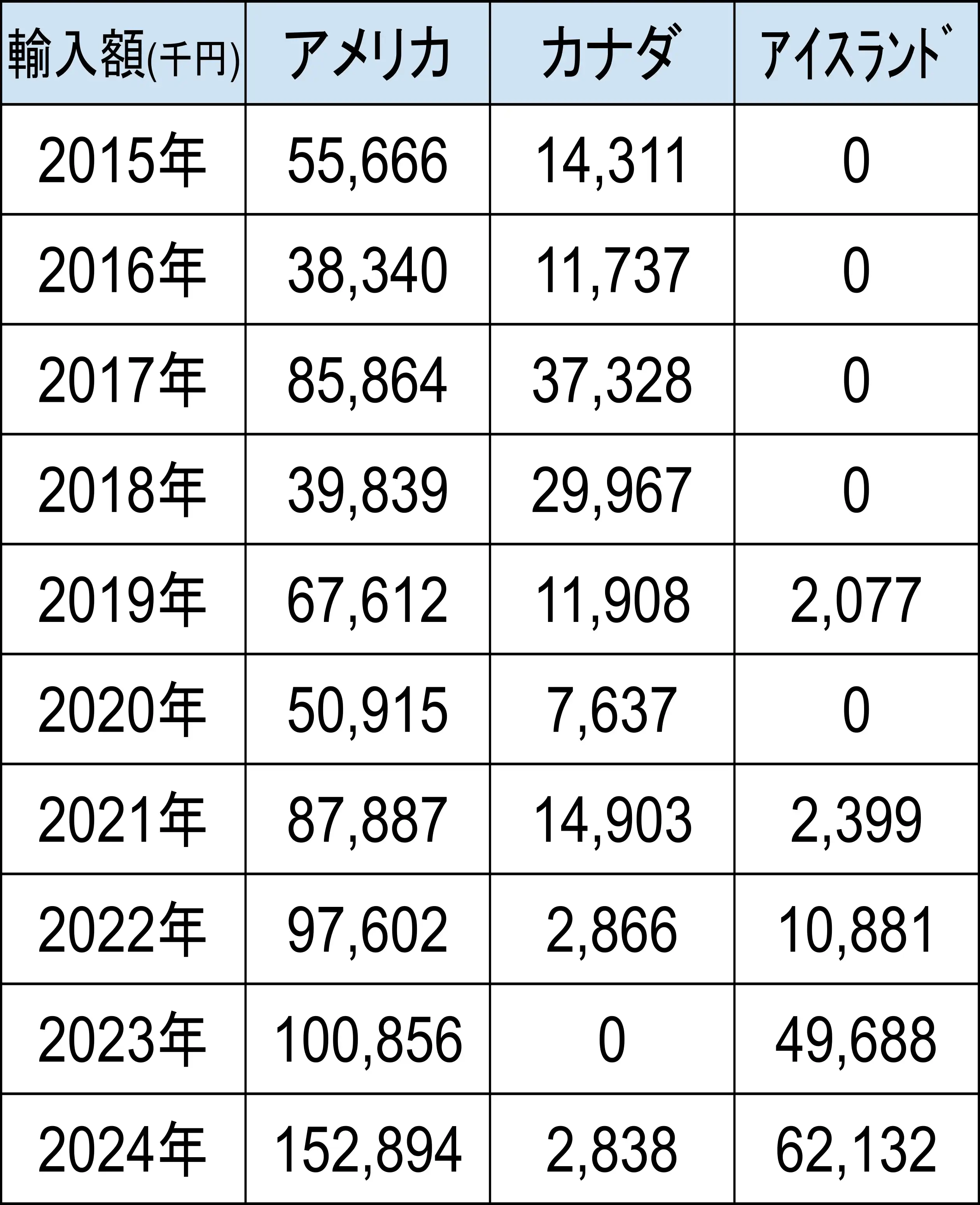 カナダからの輸入は完全に失速してしまった感がありますが、アイスランドからの輸入は増加傾向にあります。
