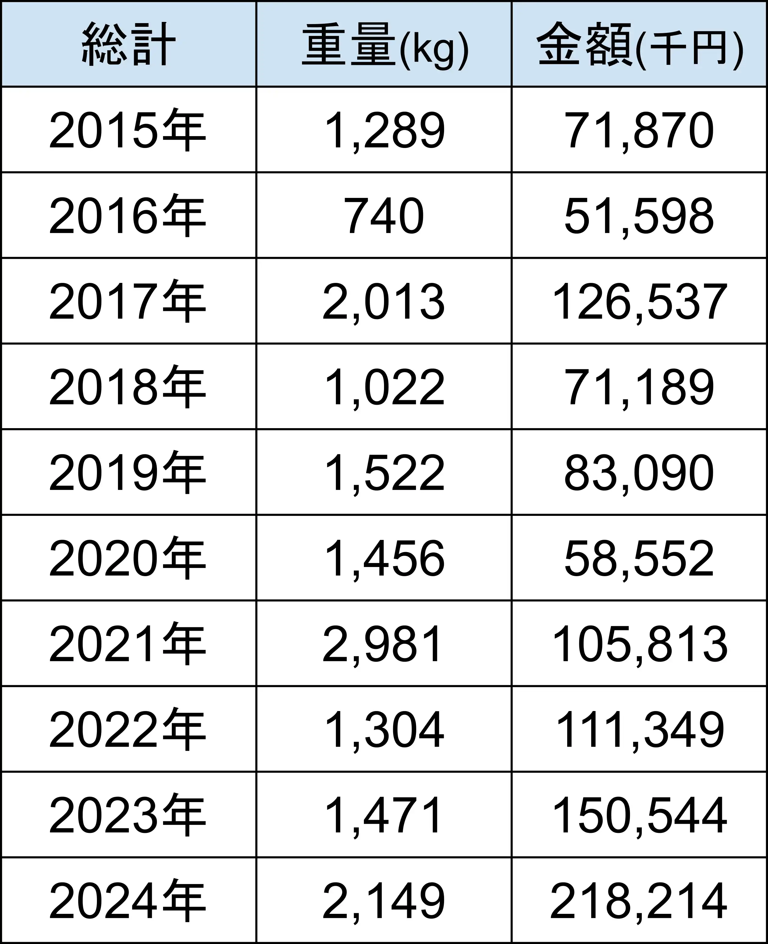 ニジマスの発眼卵の輸入のみを集計したデータは見つからなかったので、孵化用の魚卵についてのデータをもとにして近年の輸入動向を探っていきます。