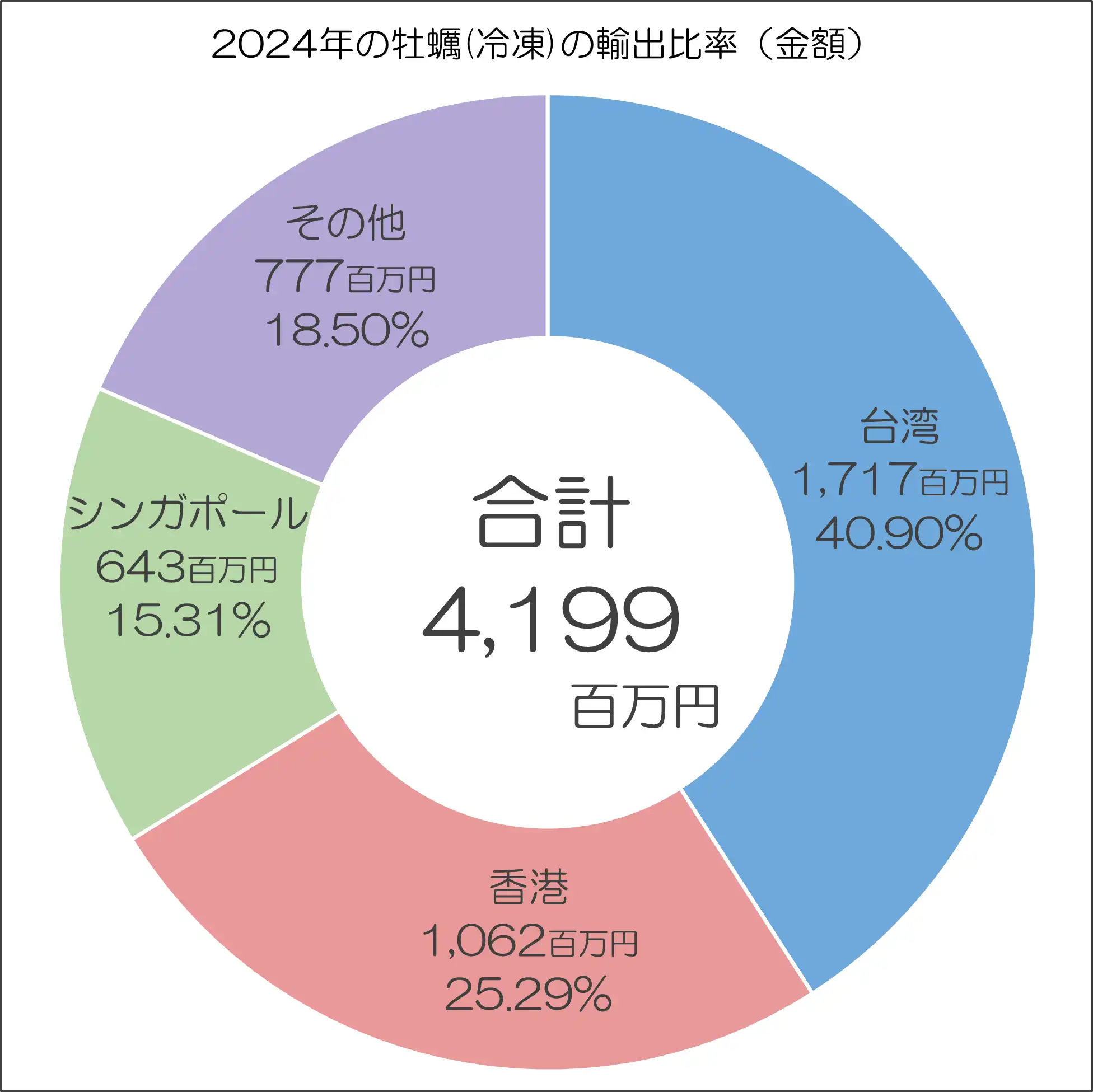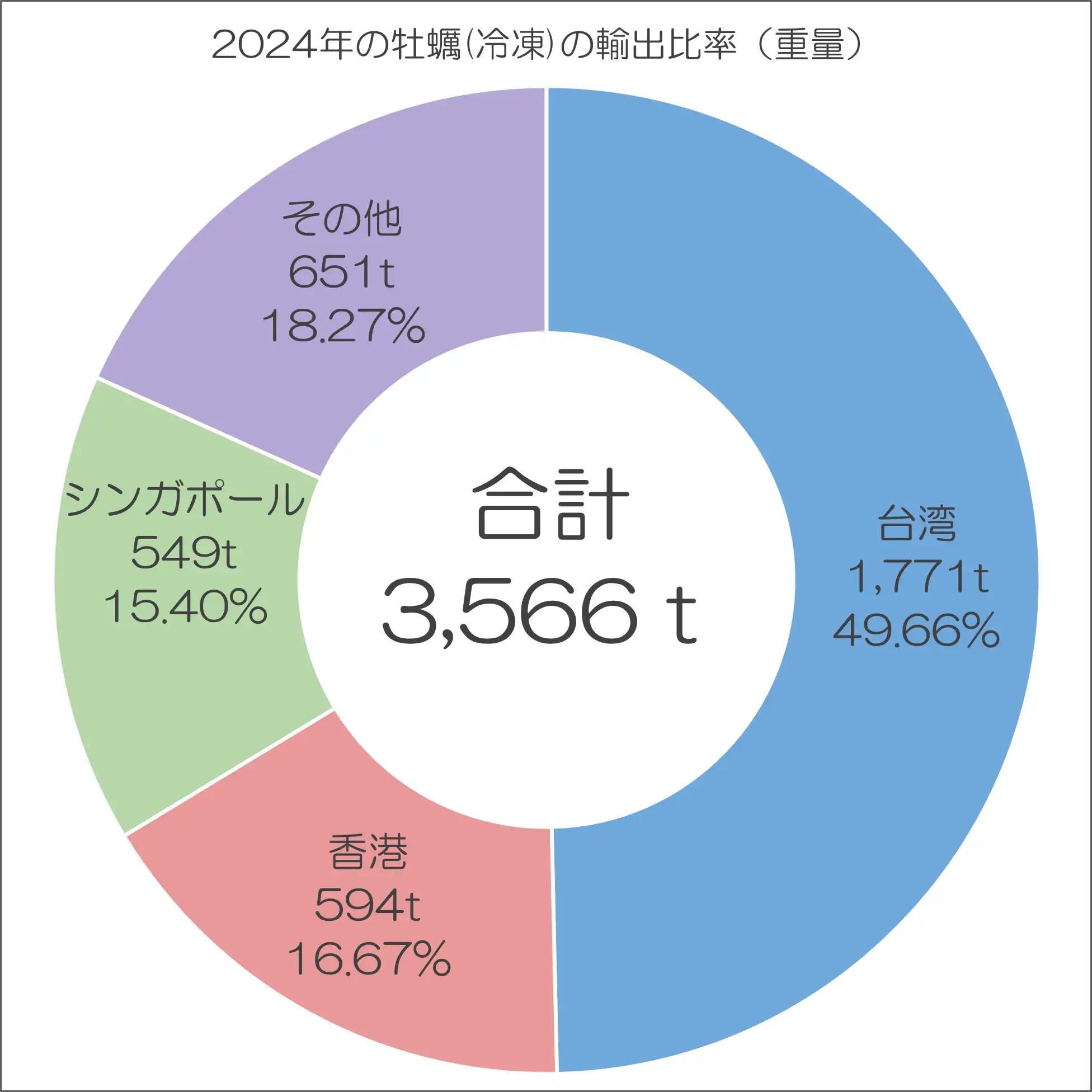 2023年2月以降、「冷凍」については殻付き牡蠣が含まれるため重量は重めになっている可能性がありますが、金額面でも「冷凍」が大きな割合を占めているため、牡蠣の輸出市場は「冷凍」が主なものとしていると言って良いと思います。