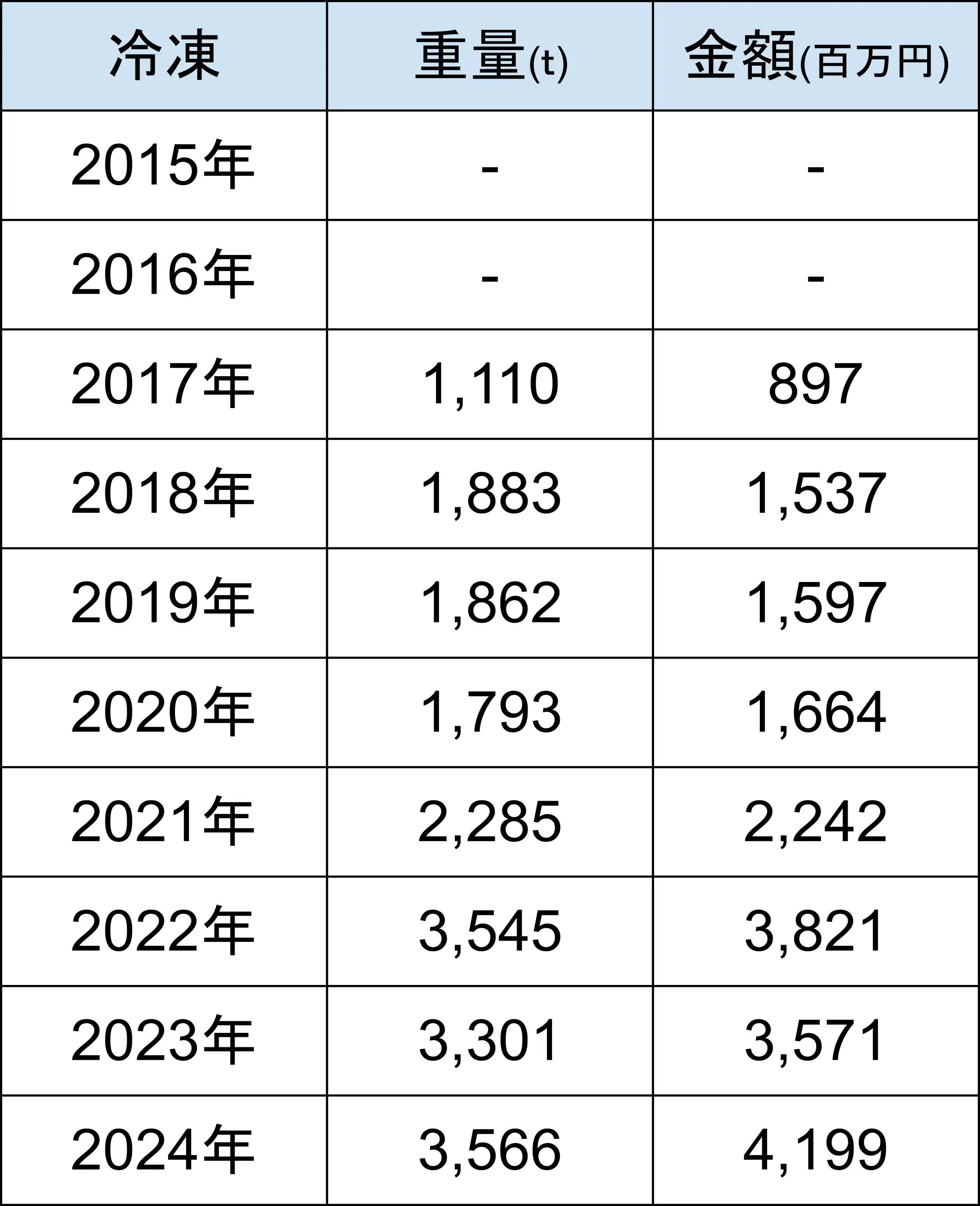2015年、2016年のデータが見当たらなかったので2017年以降の検証となりますが、冷凍牡蠣の輸出状況は好調なようです。